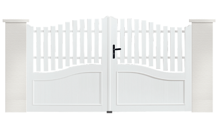 Portail en PVC blanc, battant et coulissant. Grâce aux lignes arrondies de la forme chapeau de gendarme, ainsi que par le gainage PVC du cadre inox.